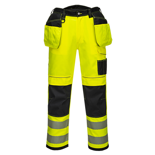 Innowacyjne spodnie ostrzegawcze z wielofunkcyjnymi kieszeniami w tym kaburowymi na nakolanniki na udzie oraz na klucze narzędzia i telefon.