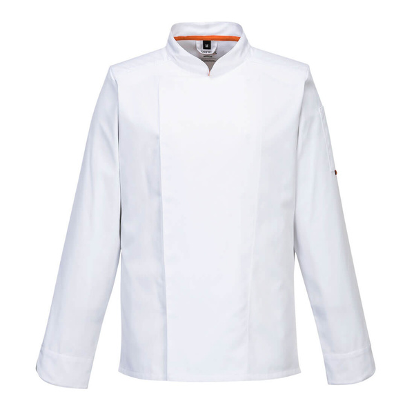 Ta elastyczna bluza kucharska wykonana jest z lekkiego materiału i ma nowoczesny, smukły oraz ergonomiczny krój. Posiada podwójne kryte zapięcie z przodu, zakładkę na fartuch z tyłu szyi oraz duże panele MeshAir Pro z tyłu i pod pachami gwarantujące doskonałą oddychalność i wentylację.